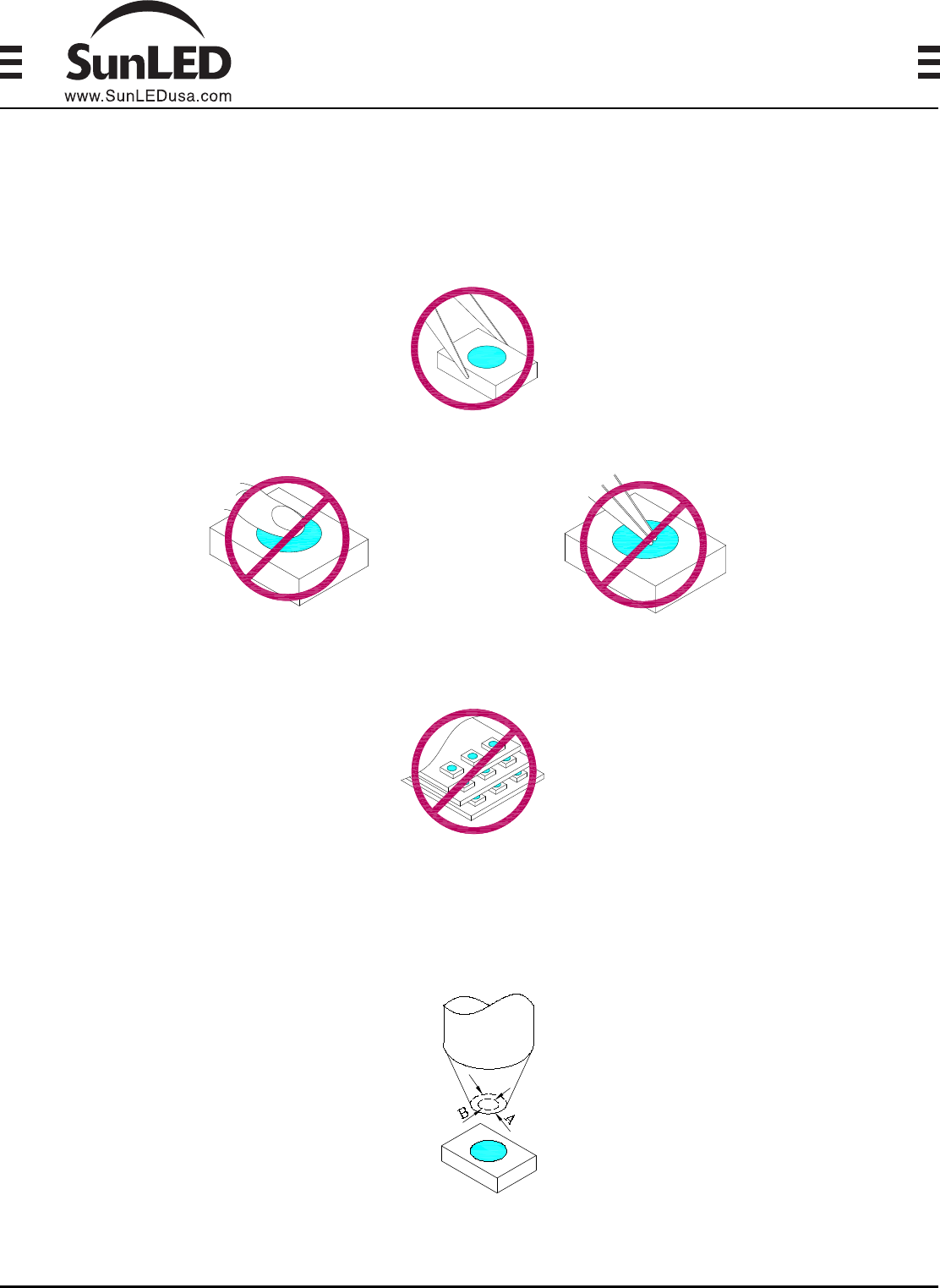 3. Do not stack together assembled PCBs containing exposed LEDs. Impact may scratch the silicone lens or