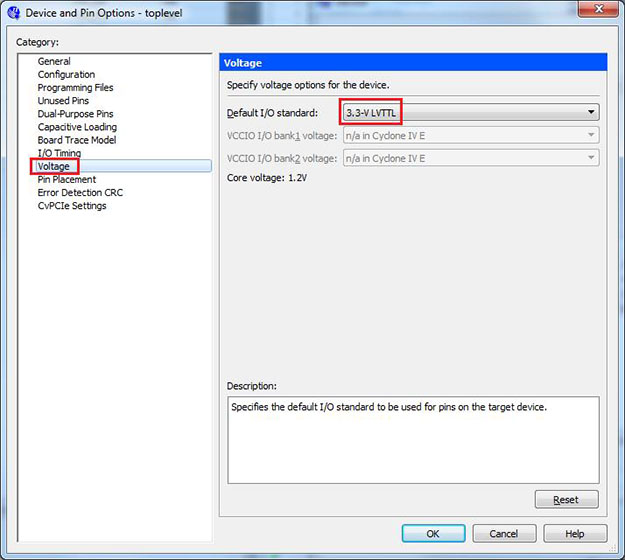 Now select the "Voltage" category. Change the "Default I/O standard" to "3.3-V LVTTL". This is essential to do because the panels will not recognize a signal below this voltage.