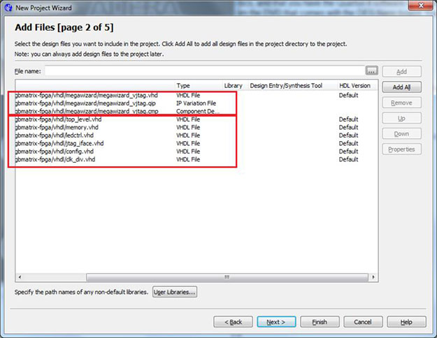 Now we will add the source code files to the project. Click the "..." button to open the file browser and select the .vhd files in the vhdl folder you downloaded earlier (do not include the testbenches directory). Click "..." again and open the megawizard folder. Set the type drop-down menu to "All Files (*.*)" so you can select the .qip, .cmp, and megawizard_vjtag.vhd files (do not include megawizard_vjtag_inst.vhd). Add them to the project and click Next.