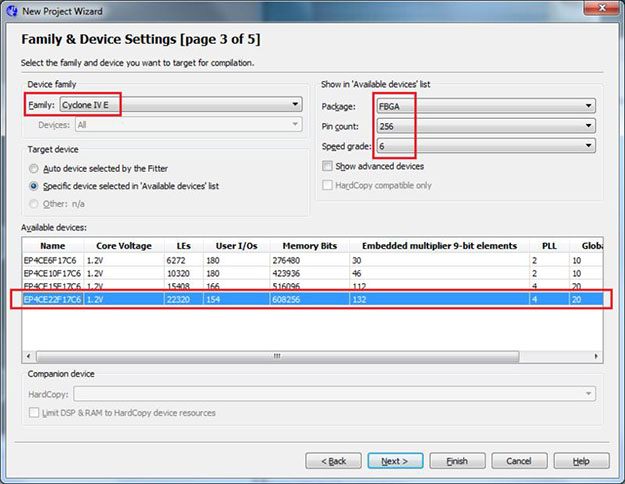 The FPGA chip in use on the DE0-Nano is the Cyclone IV EP4CE22F17C6N. You can find it by setting the device family to "Cyclone IV E", package to "FBGA", pin count to 256, and speed grade to 6. Select the chip and click Next.