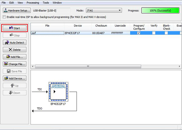 Now, select the .sof file in the list, ensure "Program/Verify" is checked, and click "Start"! This should take about a second.
