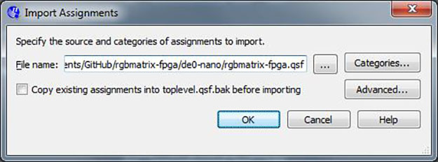 Go to the "Assignments" menu and select "Import Assignments...". Import the de0-nano/rgbmatrix-fpga.qsf file. After you do this, a message should appear in the "System" console tab at the bottom of Quartus: "Import completed. 14 assignments were written (of of 14 read)."