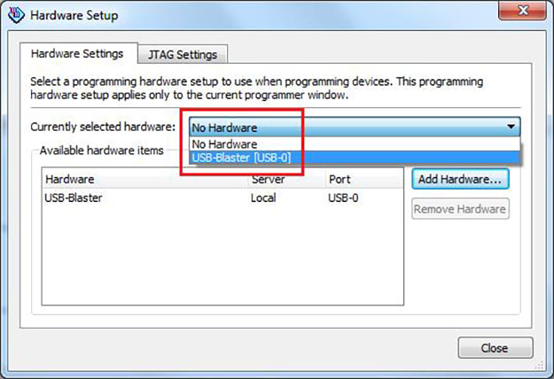 In the top left of the window that appears, you should see "USB-Blaster [USB-0]". If instead you see "No Hardware", click on "Hardware Setup..." and (re-)select your device.