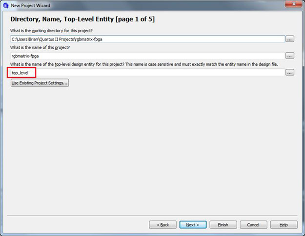 Start Quartus II and open the "New Project Wizard" from the "File" menu. On the first page, name the project rgbmatrix-fpga (or something similar) and name the top-level entity top_level. Click Next.