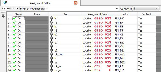 Save any changes. Now we are ready to connect the pins on the FPGA to the pins on the RGB LED matrix panel!