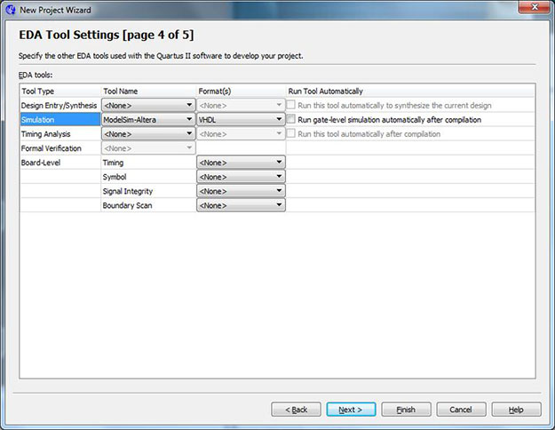 Set the "Simulation" tool name to "ModelSim-Altera" and the format to "VHDL". Leave everything else as "<None>" and click Next.