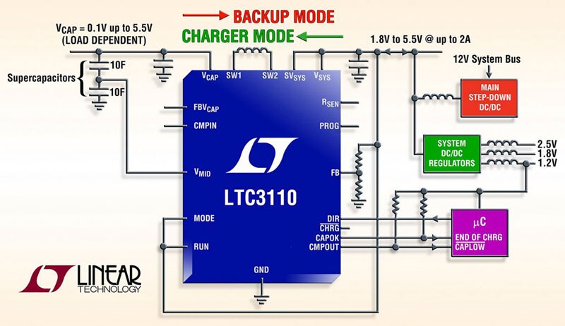 Analog Devices' 2 A buck-boost supercapacitor charger features bi-directional operation for fast charging and system backup