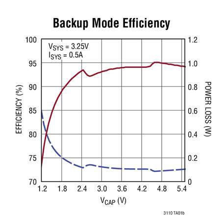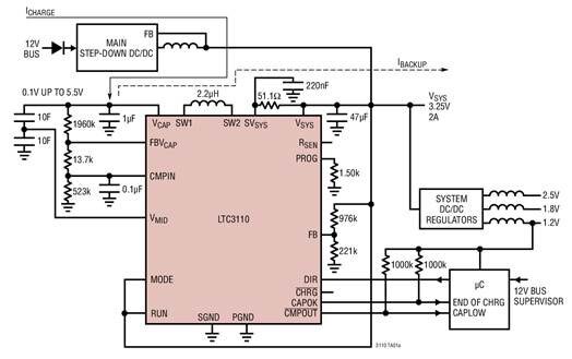 Analog Devices' LTC3110 is a 2 A bi-directional buck-boost DC/DC regulator with capacitor charger and balancer. Its wide 0.1 V to 5.5 V capacitor / battery voltage and 1.8 V to 5.25 V system backup voltage ranges make it well-suited to a wide variety of backup applications using supercapacitors or batteries. A proprietary low noise switching algorithm optimizes efficiency with capacitor/battery voltages that are above, below, or equal to the system output voltage. The LTC3110 can autonomously transition from charge to backup mode or switch modes based on an external command. Pin-selectable Burst Mode® operation reduces standby current and improves light-load efficiency, which, combined with a 1 μA shutdown current, make the LTC3110 ideally suited for backup applications. Additional features include voltage supervisors for direction control and end-of-charge, and a general purpose comparator with open-collector output for interfacing with a μC. The LTC3110 is available in thermally enhanced, low-profile 24-lead TSSOP and 4 mm × 4 mm QFN packages.